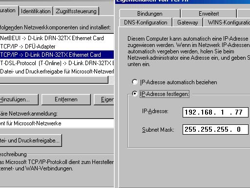 In der Systemsteuerung => Netzwerkumgebung => TCP/IP -> 'Name der Netzwerkkarte' => IP-Adresse