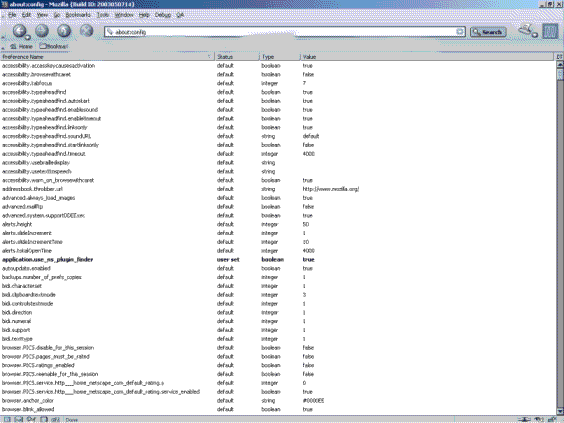 Wem die Einstellmöglichkeiten von Mozilla, die das Menü hergibt, zuwenig ist, der kann auch alles Haarklein selber konfigurieren. Gibt man in die Adresszeile about:config ein, so hat man Zugriff auf jede noch so unbedeutende Variable und kann den Browser nach seinen Wünschen optimal konfigurieren. Das funktioniert aber erst mit der Version 1.3 oder höher.